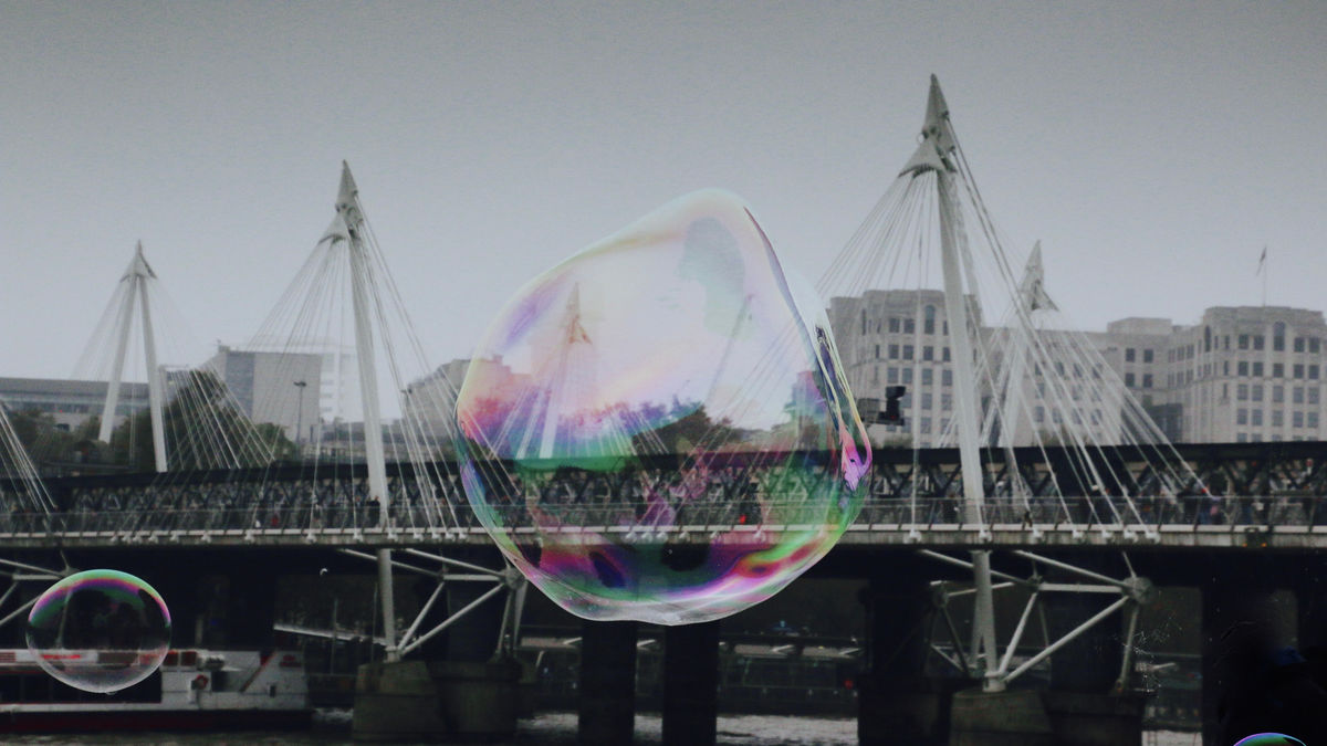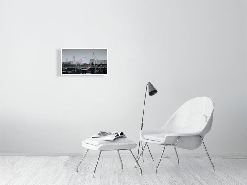 Along the Thames River in London, a children's' entertainer was creating large bubbles. One floated away towards a walking bridge over the river. When it got to the center, I took its photo. Beautiful colors on a gloomy London day.