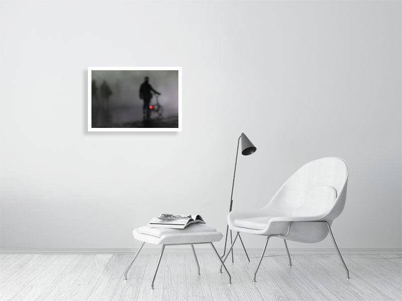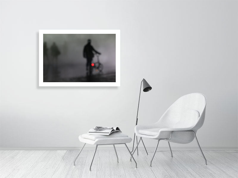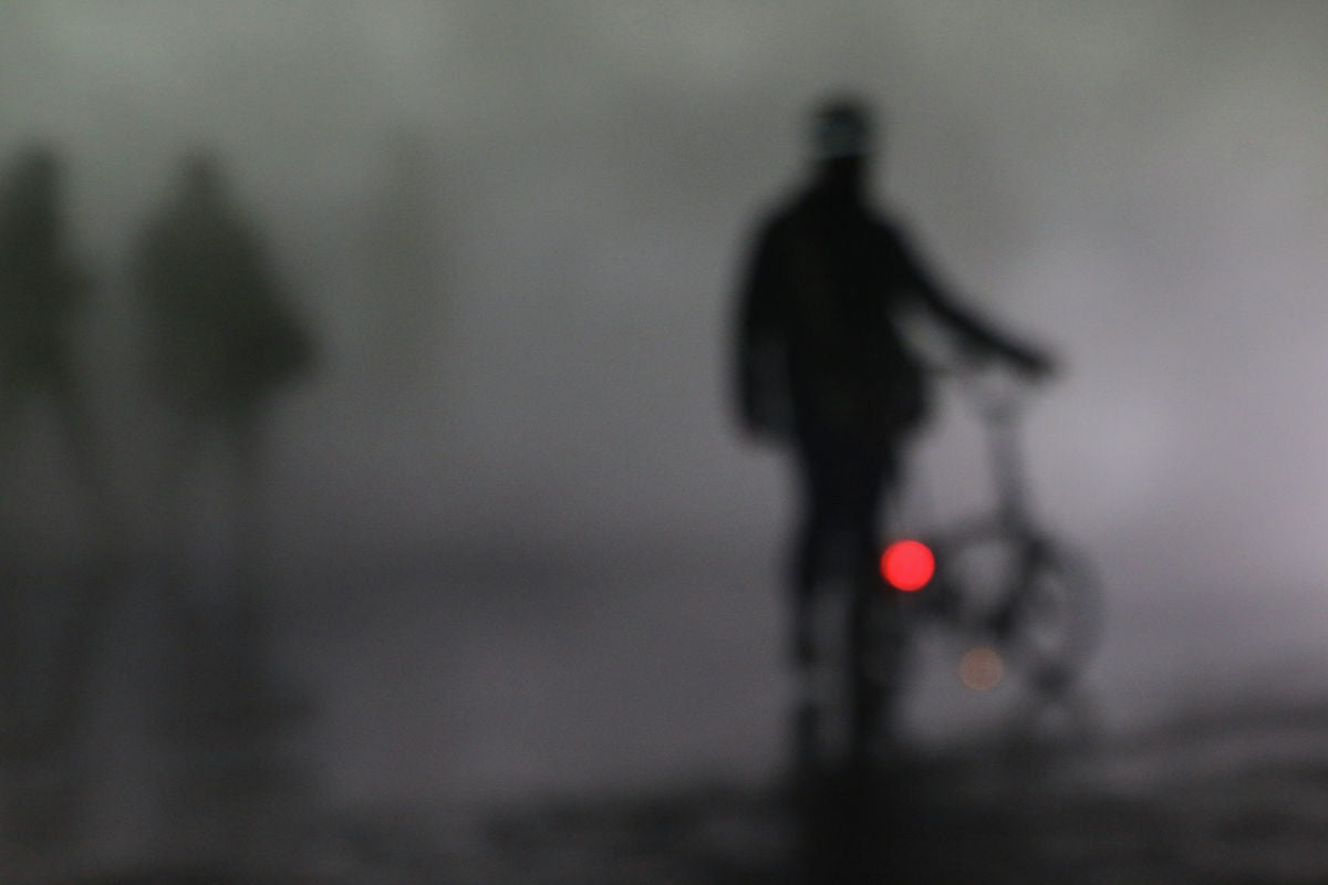 An evening event at Somerset House in London. The courtyard was filled with a misty fog for people to walk through. This boy walked in with his bike. I loved that the only color in the photograph . . . the red light on his bike.