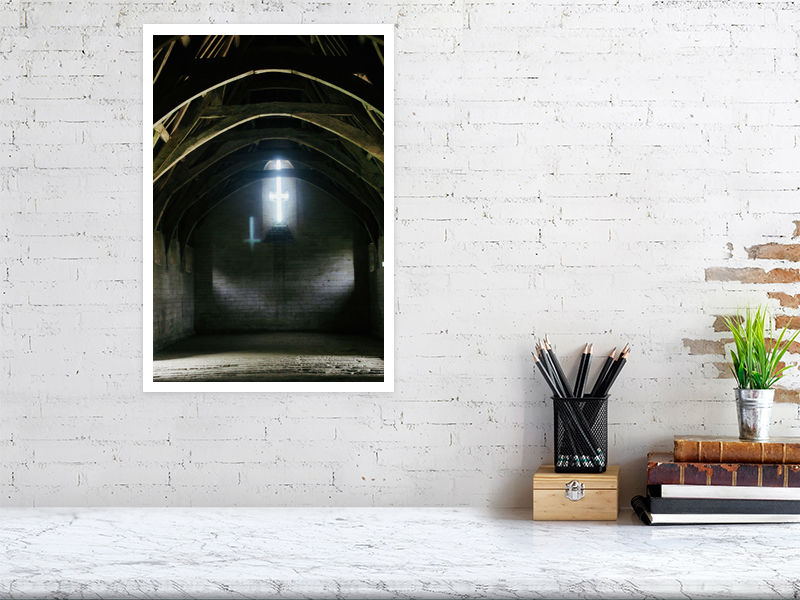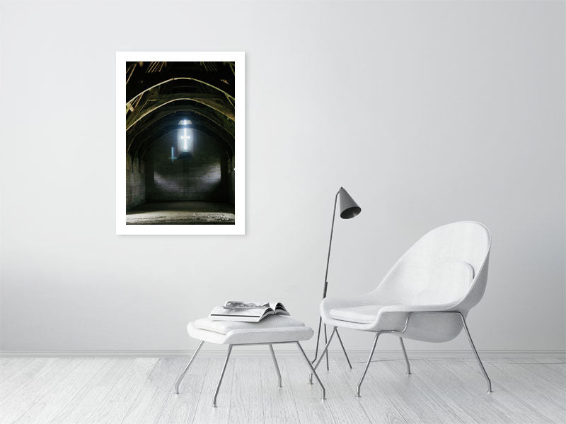 Photographing the inside of this Tithe Barn in Bradford on Avon. A photographer's dream of light and shadows. I took about ten photos. When I got home and I looked at them, this is the only photograph where a light turquoise cross appeared in the wall . . . you tell me!